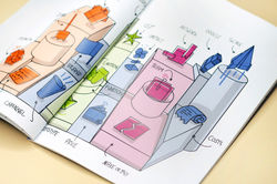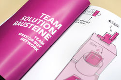 Durch das Buch geführt wird man durch eine große gemeinsame Illustration, die sich aus vielen Einzellbausteinen zusammensetzt und am Ende alle Kapitel vereint. Diese Bausteine beschreiben dann die jeweiligen Kapitel. Sie sind farblich abgesetzt und sie passen am Ende alle, wie ein Puzzle, in das Gesamtbild. Durch ein kleines Gesamticon, das farblich markiert ist, sieht man immer genau wo man gerade steht.