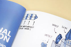 An mich geliefert wurde lediglich der Text und dazu ist alles passend gestaltet worden. Angefangen von der Konzeptfindung des Layouts, des Illustrationsstils, Schriften, Farben, Formen, der Seitennavigation, bis hin zu Größe, Umsetzungsart, Papier und Machart.