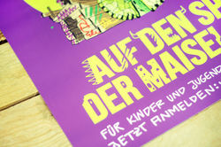 Ein tiefes Lila und ein helles Grün heben das Motiv in eine knallige und kontrastreiche Farbwelt, die ebenso bunt ist wie der Ferienspaß selbst.